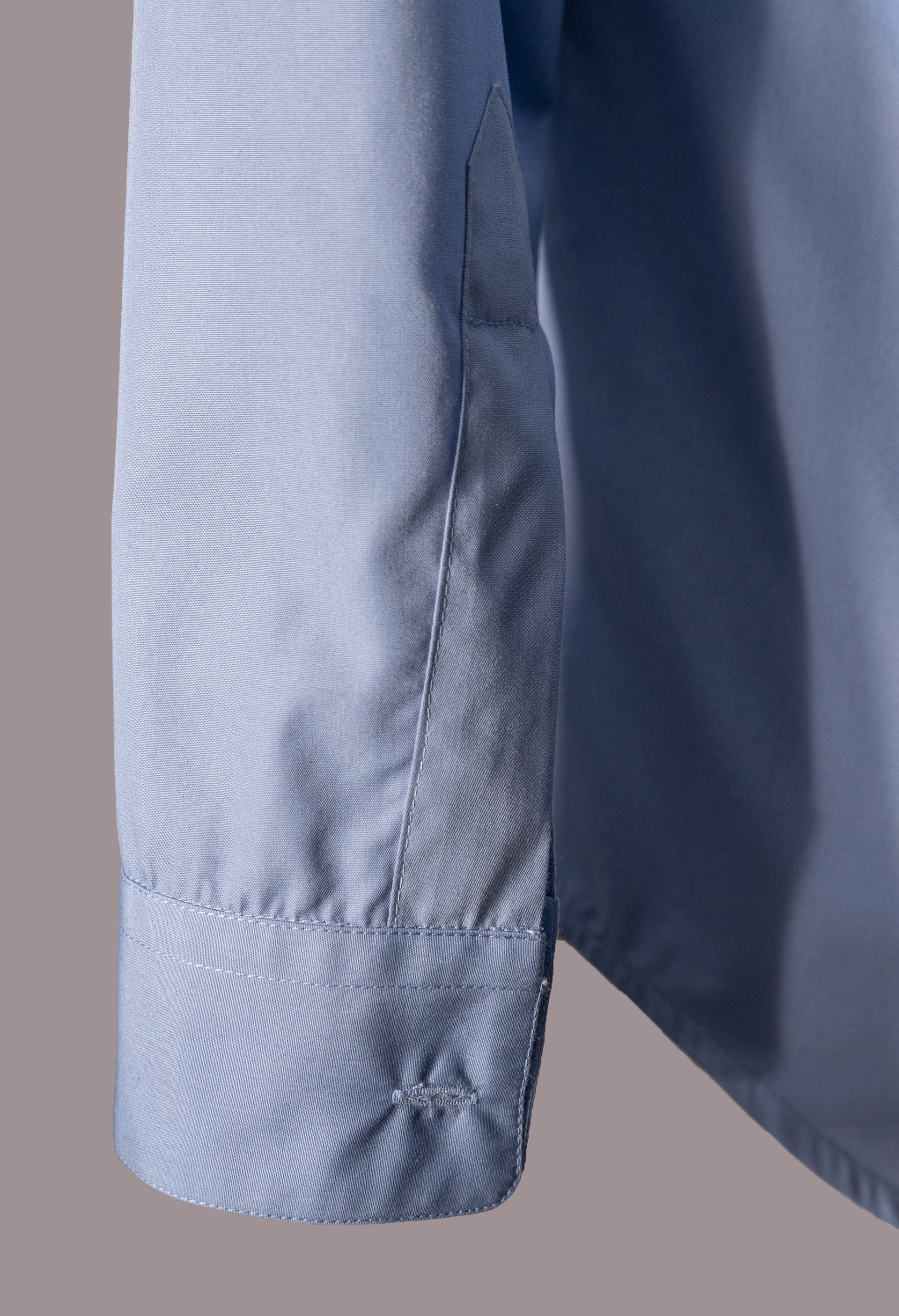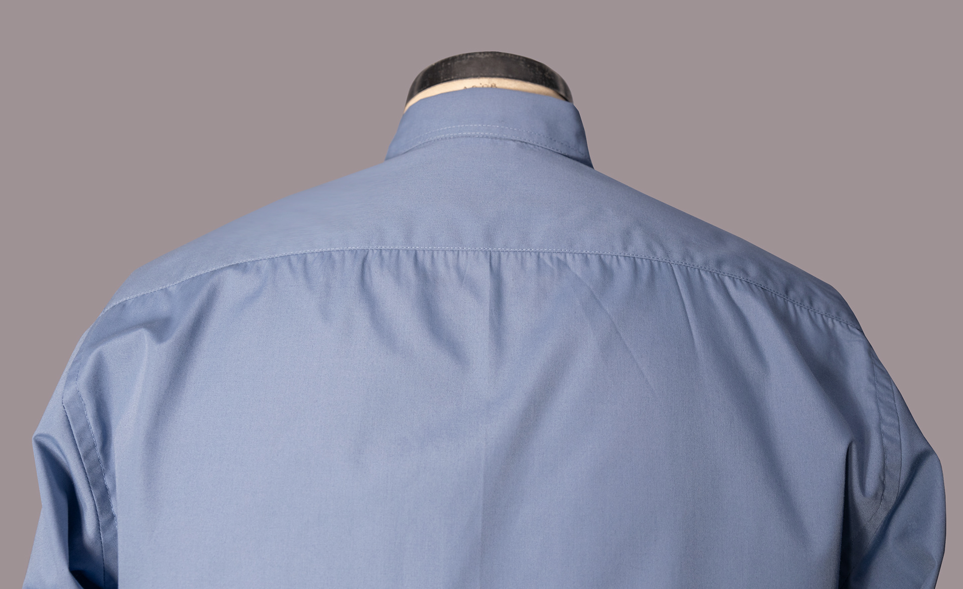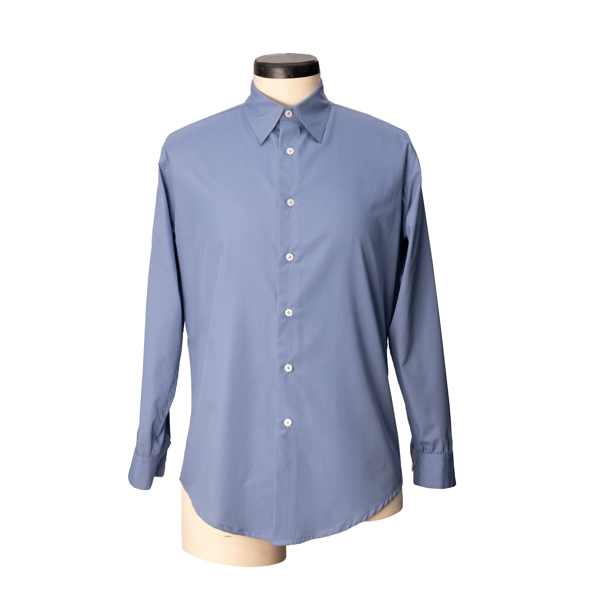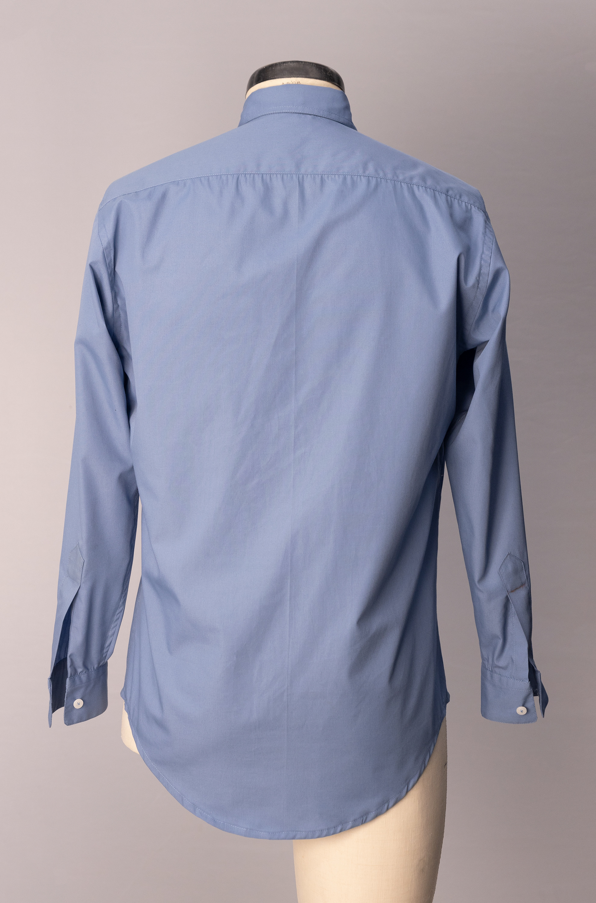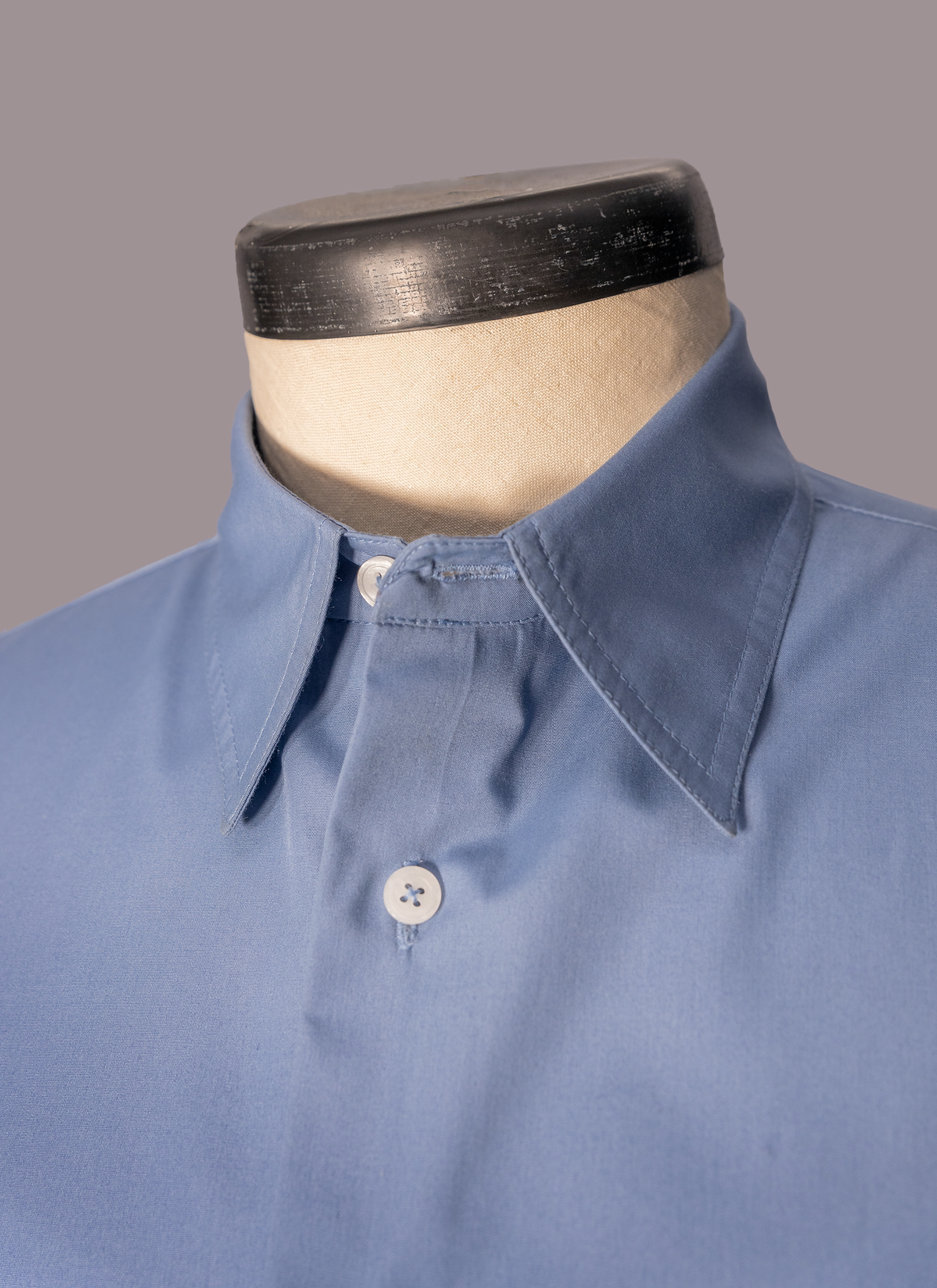 A classic mens dress shirt fitted to my body and sewn in a soft blue cotton shirting fabric.
