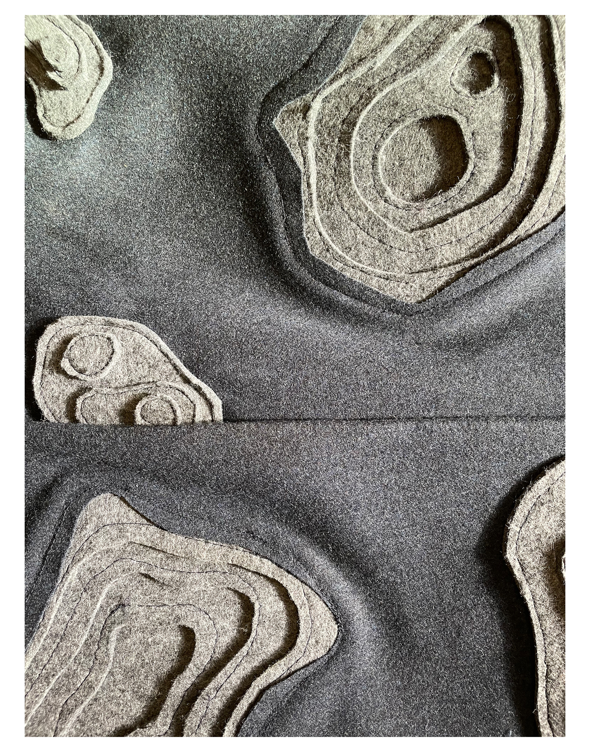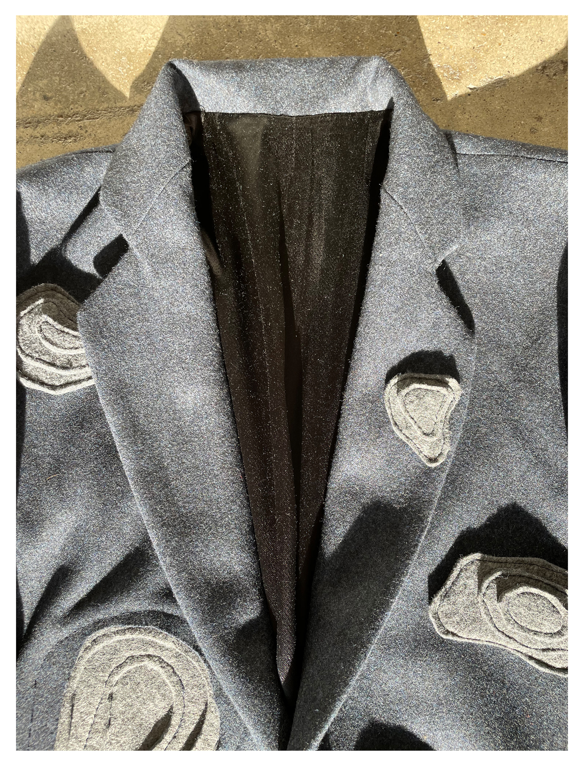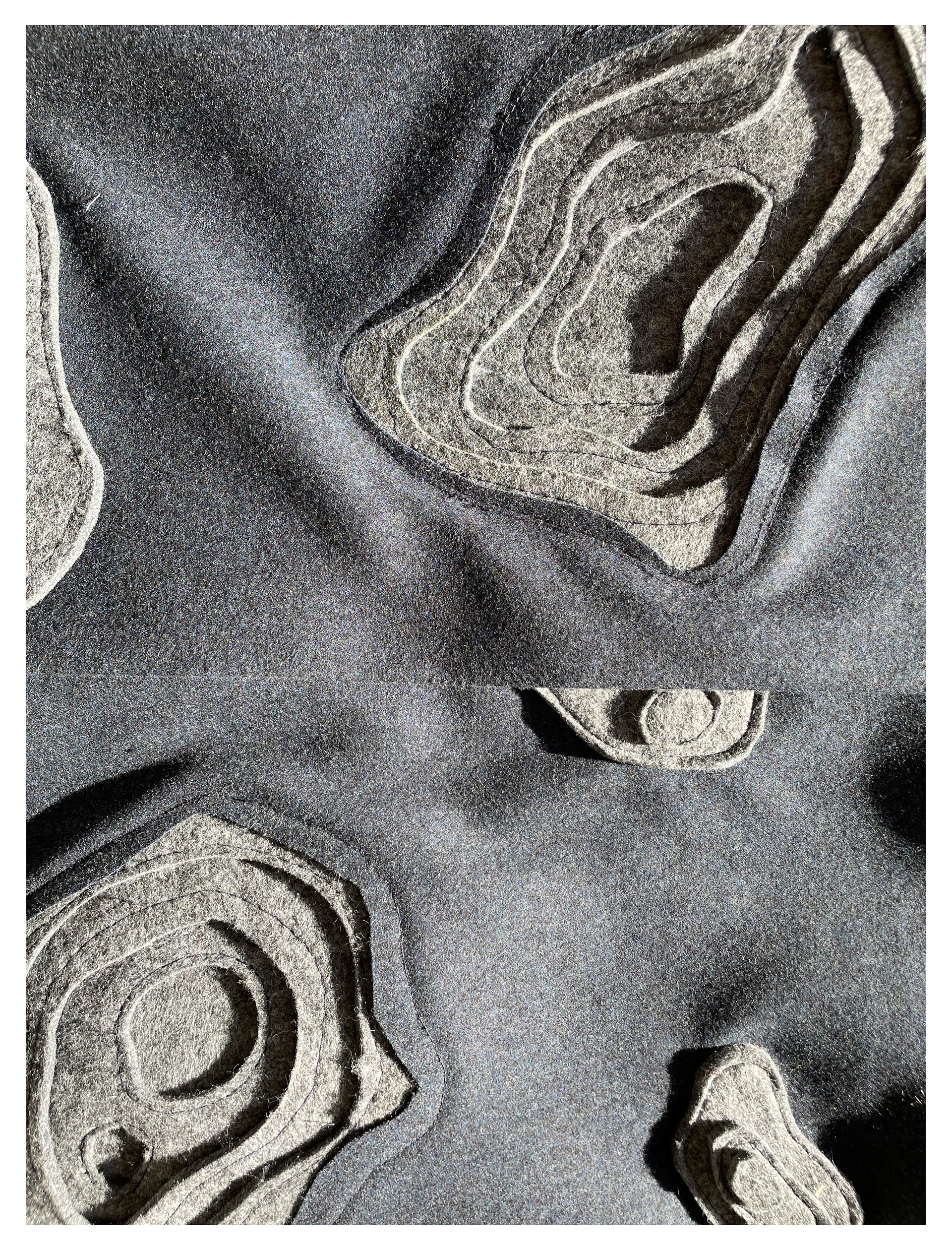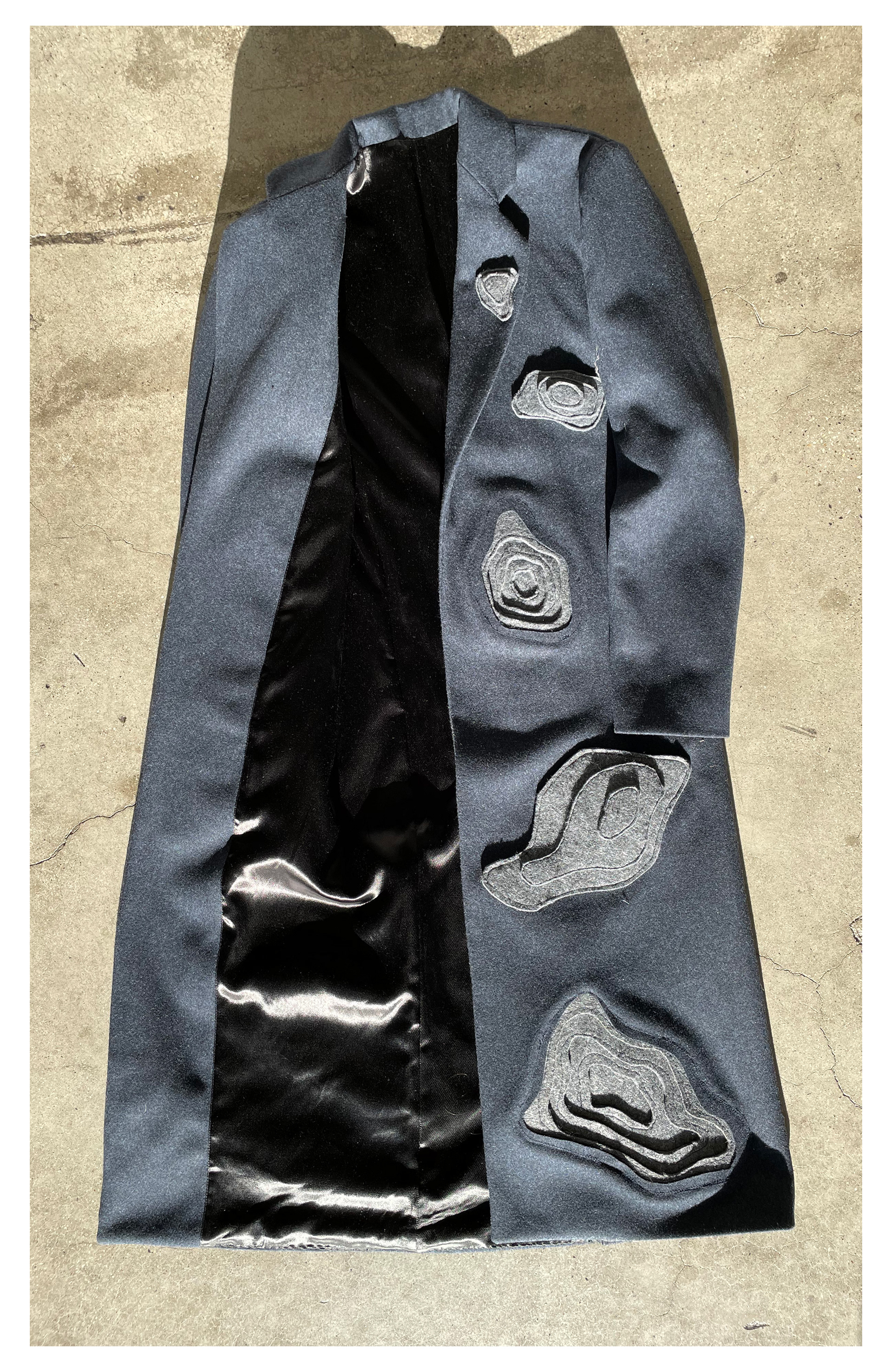 Tailored Wool overcoat with topographic style felt application creating three dimensional convex and concave shapes throughout the garment. Each felt piece was patterned and hand sewn together.