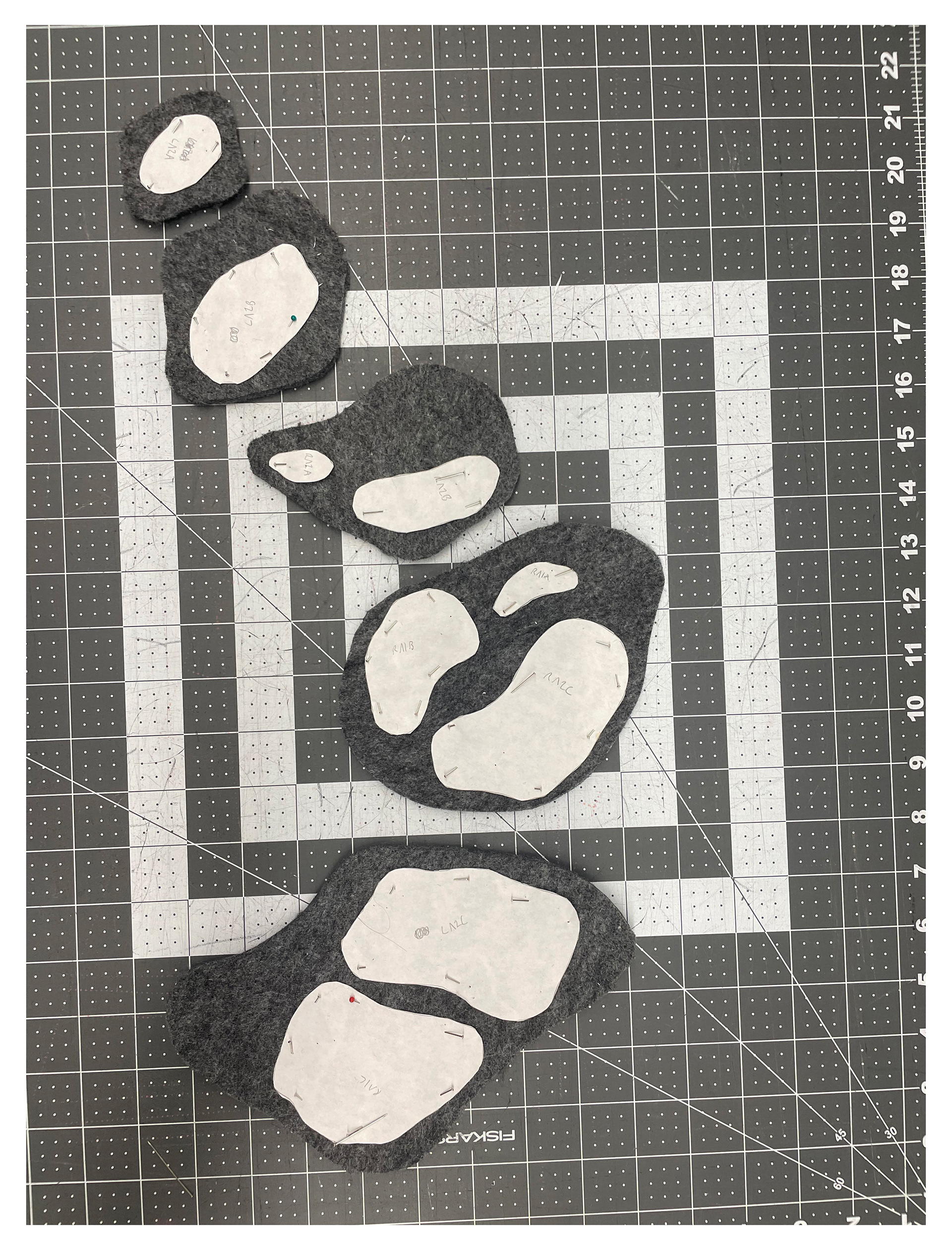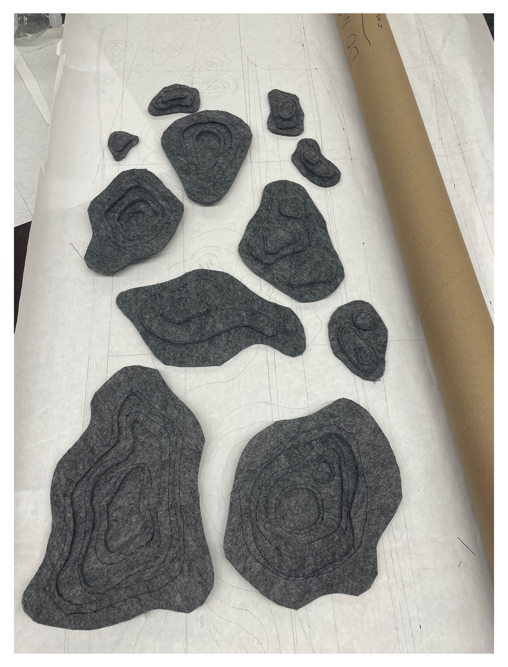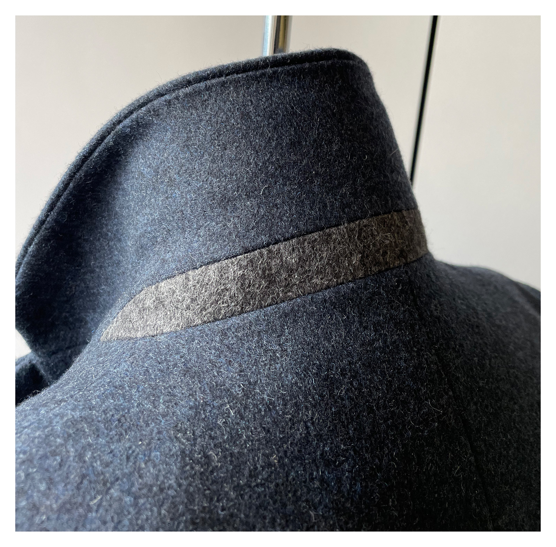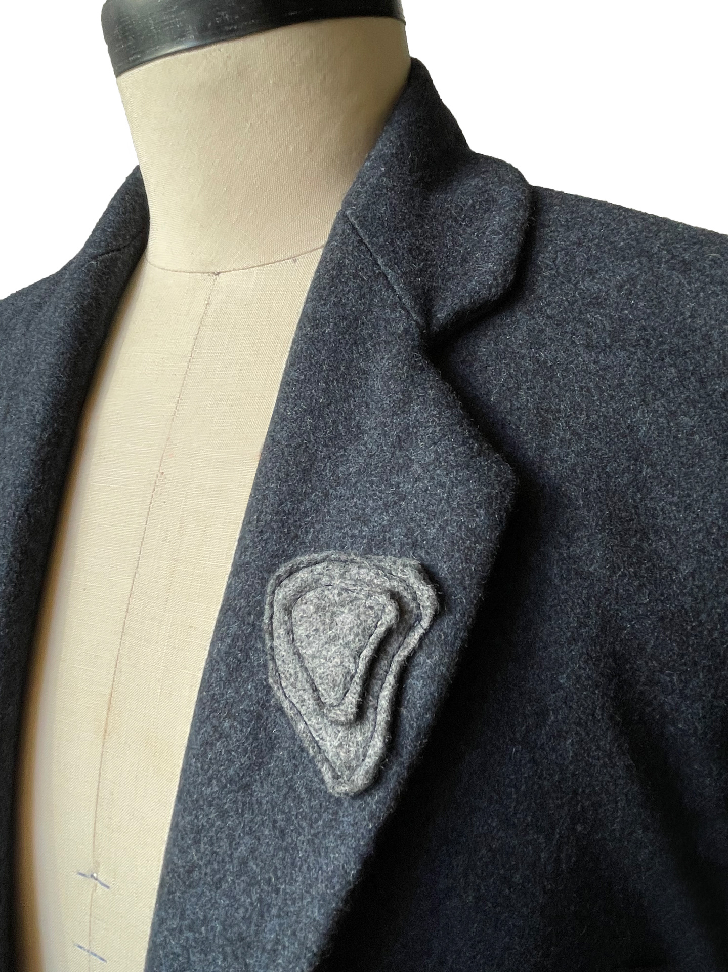 Tailored Wool overcoat with topographic style felt application creating three dimensional convex and concave shapes throughout the garment. Each felt piece was patterned and hand sewn together.